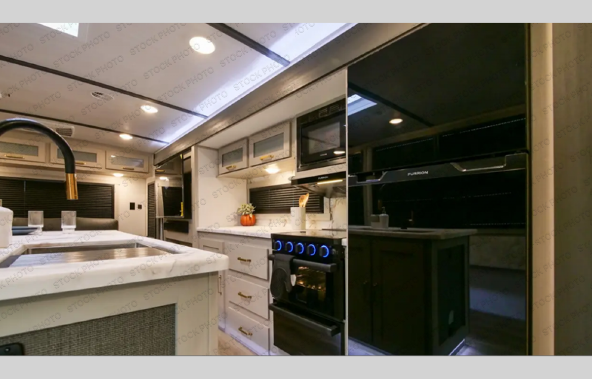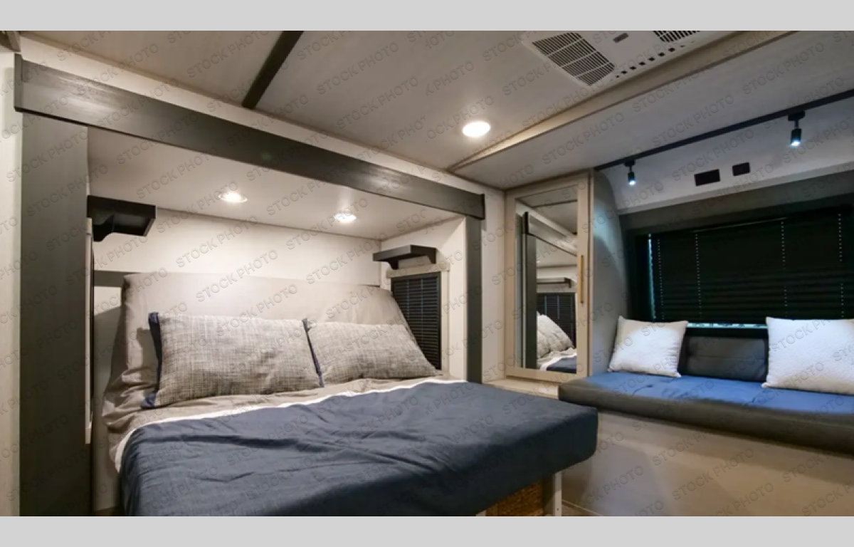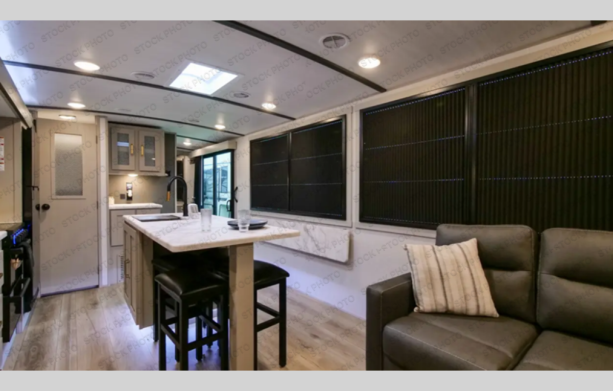 Doubles slides, a front private bedroom, and sleeping space for four to five make this travel trailer the perfect RV for camping trips. You will love the unique swing-open entertainment center with a 50" TV and fireplace and hidden storage with shelves. The L-shaped sofa will be great for lounging and the kitchen island with five stools provides a place to dine at each day. There is also a kitchen pantry, a coffee bar where you can set up your Keurig machine plus plenty of overhead cabinets for added storage. When you're ready for some shut-eye, the front private bedroom will bring comfort with its custom king bed with Versa Tilt, front bench with reading lights, and removable shelves with a hanging rod to keep clothes wrinkle-free. And did we mention this model has sliding glass patio doors for a more residential feel!