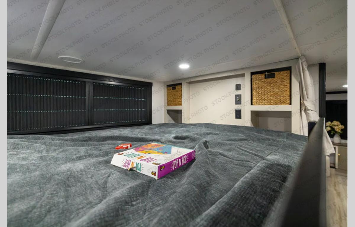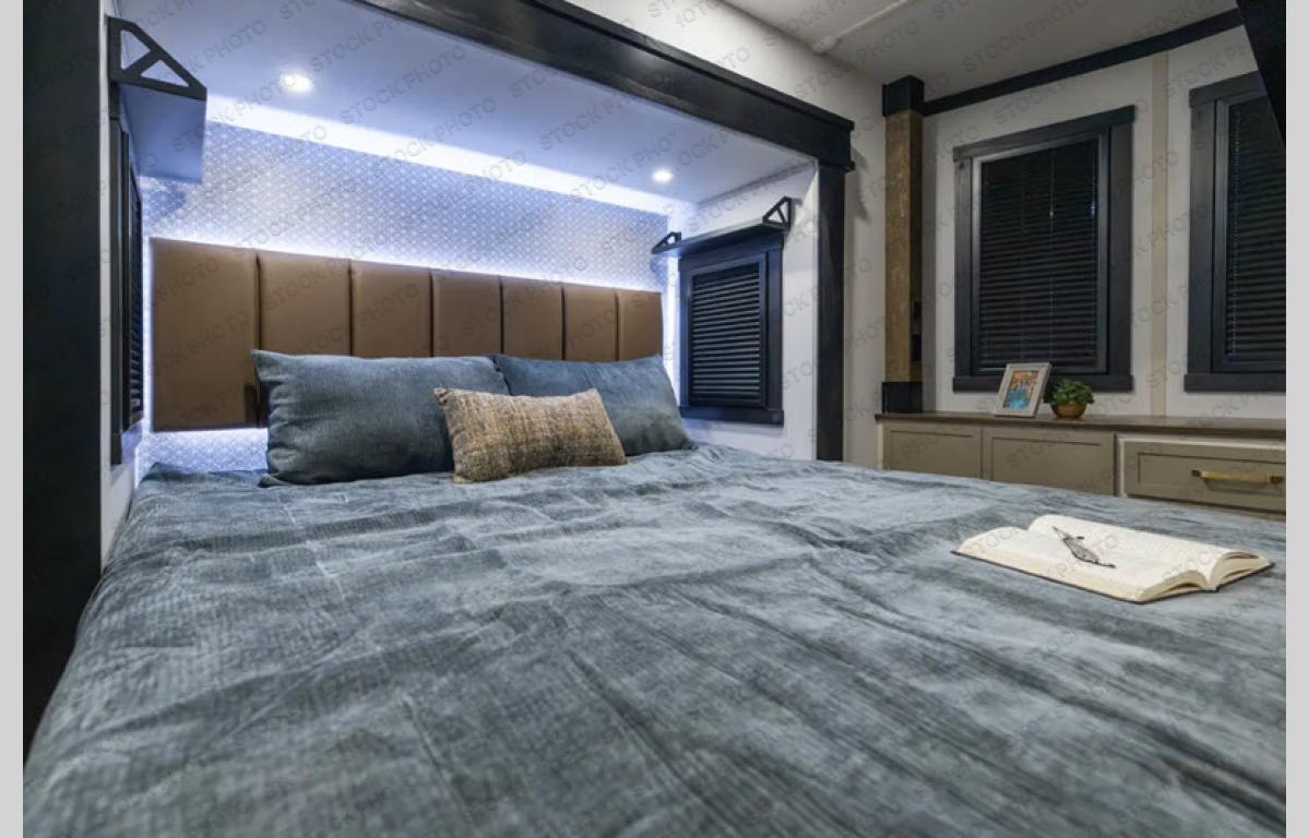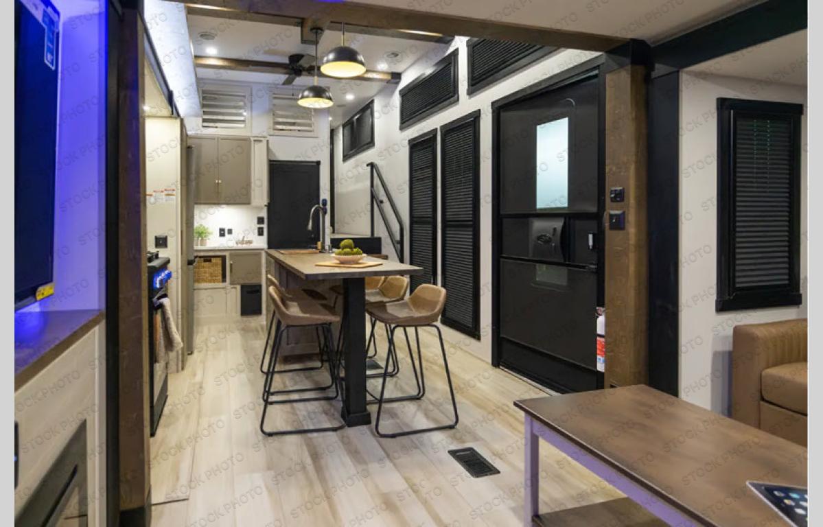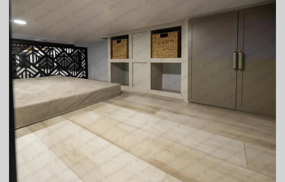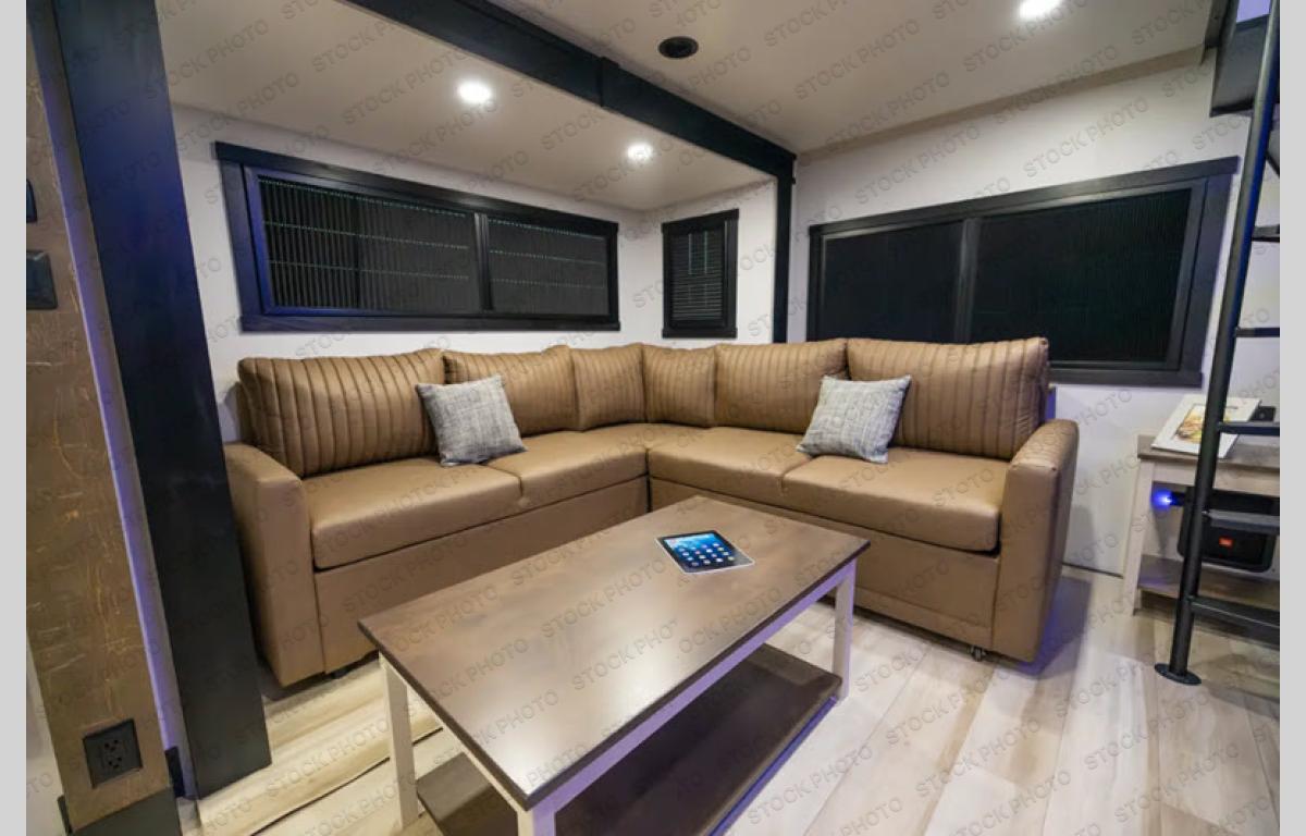 Introducing a new RV of its kind, the ROOST43 is a destination-style fifth wheel you are sure to love! There are two levels, making it feel more like home, and you can sleep six to seven each night. The master bedroom includes a custom king bed slide out, a wardrobe and a desk/vanity for getting ready for the day or getting some work done, plus a half bath for convenience. A custom king-size bed is also found in the front loft, and there are storage cubbies plus a coax/100V outlet here to plug in chargers or a laptop. The second loft in the back includes spiral stairs, two bunk mats, a wardrobe, and cubby cubes here also for your guests' things. Some of the stand-out features you'll find on the first level are the sectional sofa with a coffee table, an entertainment center with a 65" TV, a kitchen island with five chairs, and a fully equipped kitchen. The 20-cu. ft. 12V refrigerator and pull-out pantry will let you stock up on food, and the kitchen hutch will be perfect for nice dishes. The full bath on this model is one to remember; there is a one-piece fiberglass shower with a teak seat, a flip-up shelf and a washer/dryer, a backlit mirror, and more. And we haven't even touched on the exterior features, such as the pull-out tray, outdoor refrigerators, 20' awning, and more!