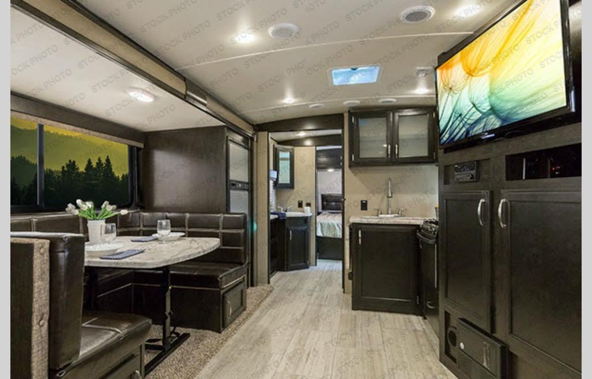 To the left of the main entry door find a tri-fold sofa with end tables along the rear wall with overhead storage or you can choose optional theatre seating if you like. Along the road side wall there is a slide out u-shaped dinette, and a refrigerator with a pet dish below. On the opposite side you are sure to enjoy the angled entertainment center with a LED TV, a pantry for your non-perishables, and the kitchen appliances. There is a three burner range with overhead microwave, corner countertop, and kitchen sink. Plus there is a countertop extension and overhead storage.
