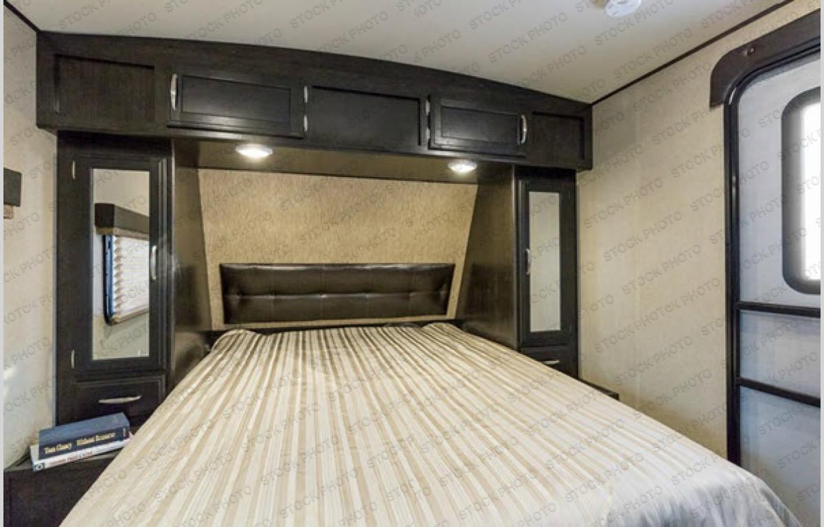 The master bedroom gives mom and dad a bit of privacy with a sliding door. Inside enjoy a comfortable queen size bed, dual bedside wardrobes, and overhead storage. Plus there is a second entry door into the trailer as an added convenience.
