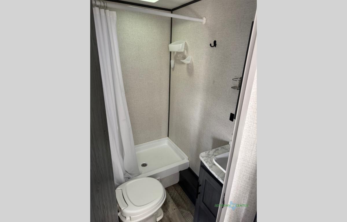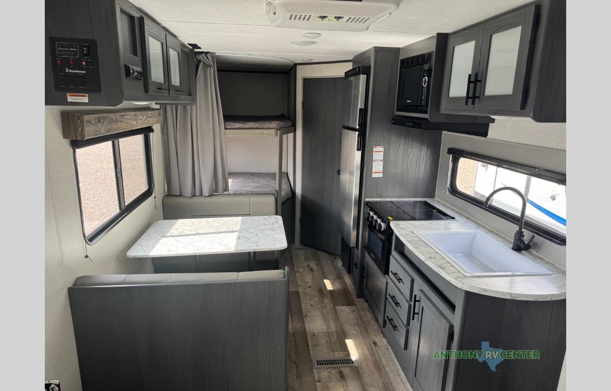 Enjoy privacy in the front bedroom when you close the curtains. You can sleep on your own residential queen bed, and there are two wardrobes to stow away your clothes. Your family and friends can sleep on the double-size bunks in the rear next to the full bathroom with a shower, and the booth dinette as well as the sofa provide extra sleeping space. The 7 cu. ft. refrigerator will hold your cold items, and you can cook using the range top, and keep everything clean using the galley sink with high rise faucet. And the overhead cabinets will hold your dishes, snacks and such.
