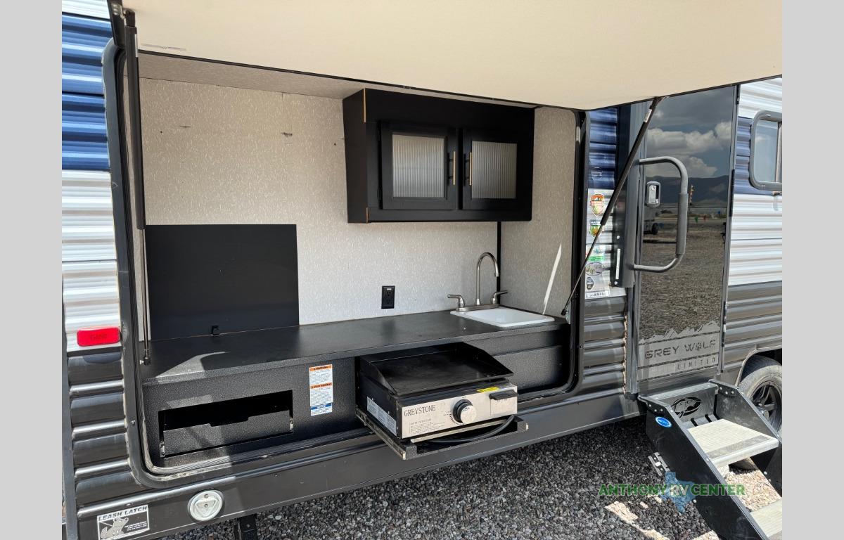 Whether it's a journey that will take you to new locations or a tried-and-true getaway to that favorite and memorable destination, the Forest River Cherokee Grey Wolf travel trailers and toy haulers are going to make the trip worth it every single time! You can travel in confidence with the premium wheel package, seamless roofing membrane with heat reflectivity, Power Gear frame technology with space-saver rail design, and Cherokee back-up camera system. The Cherokee Grey Wolf's interior is highly attractive with its stainless steel kitchen suite package, premium bedding ensemble and comforter, and 8" ceiling-mounted subwoofer with accent lighting. You will also find a black waste tank flush-out kit, an outside shower with hot and cold water, an armored underbelly tank enclosure, a power tongue jack, and an RV grill quick connect.