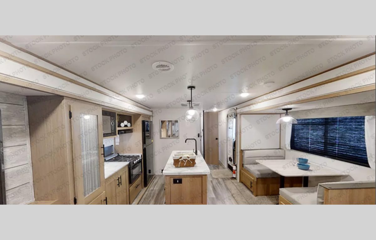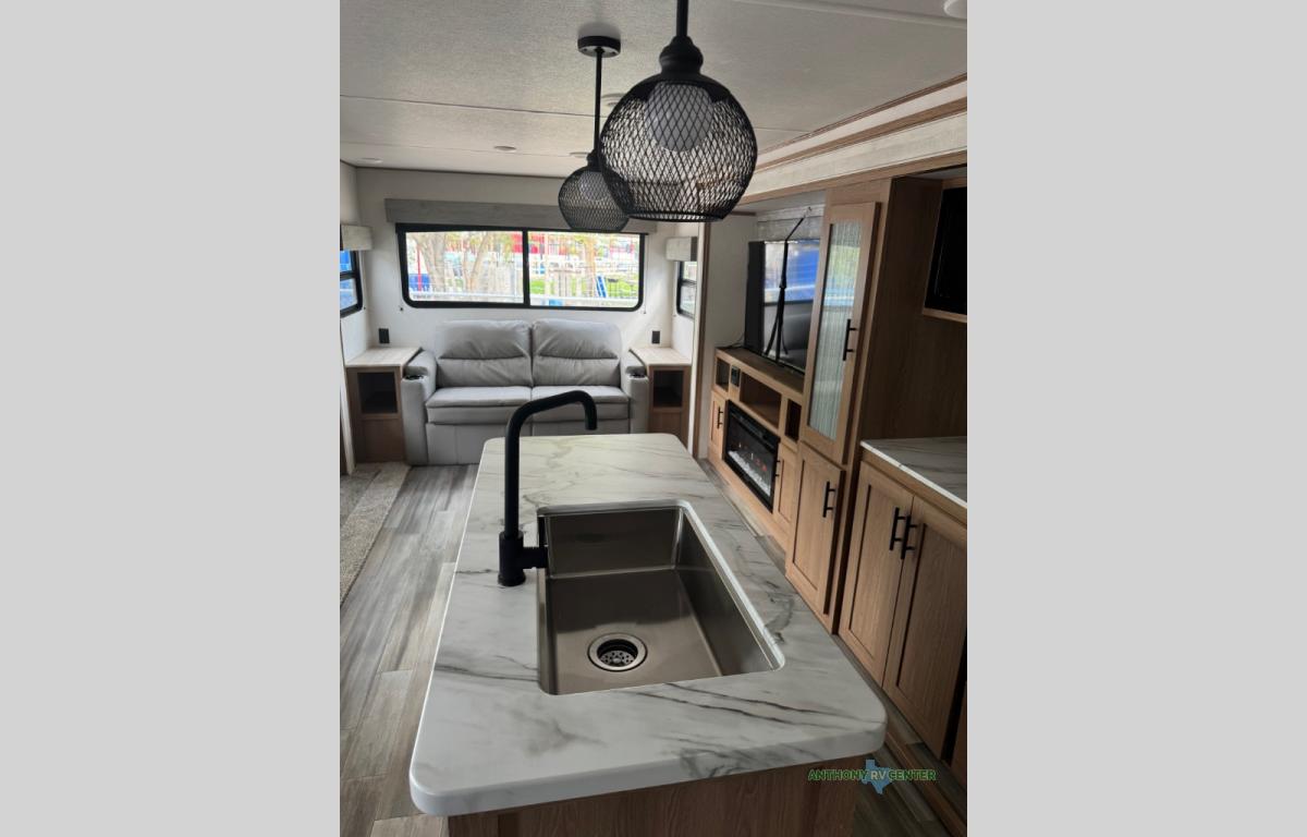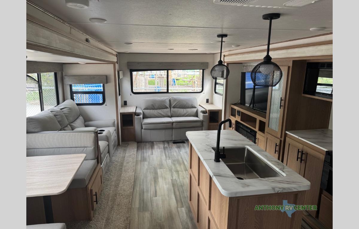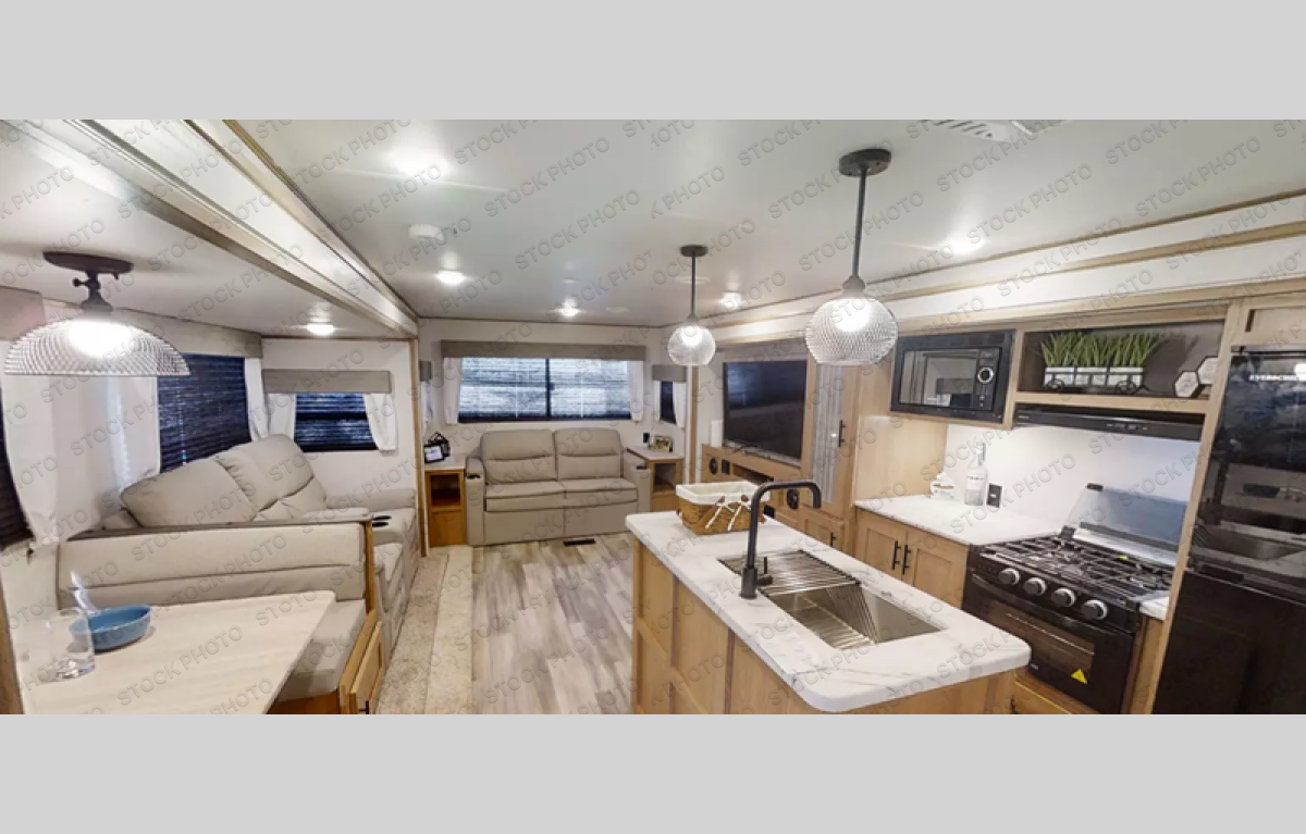 A couple or family will enjoy all the space in the main living and kitchen area, and the privacy in the front bedroom. As you spend each night sleeping on the queen-size bed in the master suite, you will appreciate the convenience of discreetly entering the full bathroom with a neo-angled shower without waking up your guests who are sleeping on the sofa or booth dinette. Because there have been two opposing slides included in the central living area, there is plenty of space to prep dinner or wash dishes on the kitchen island.