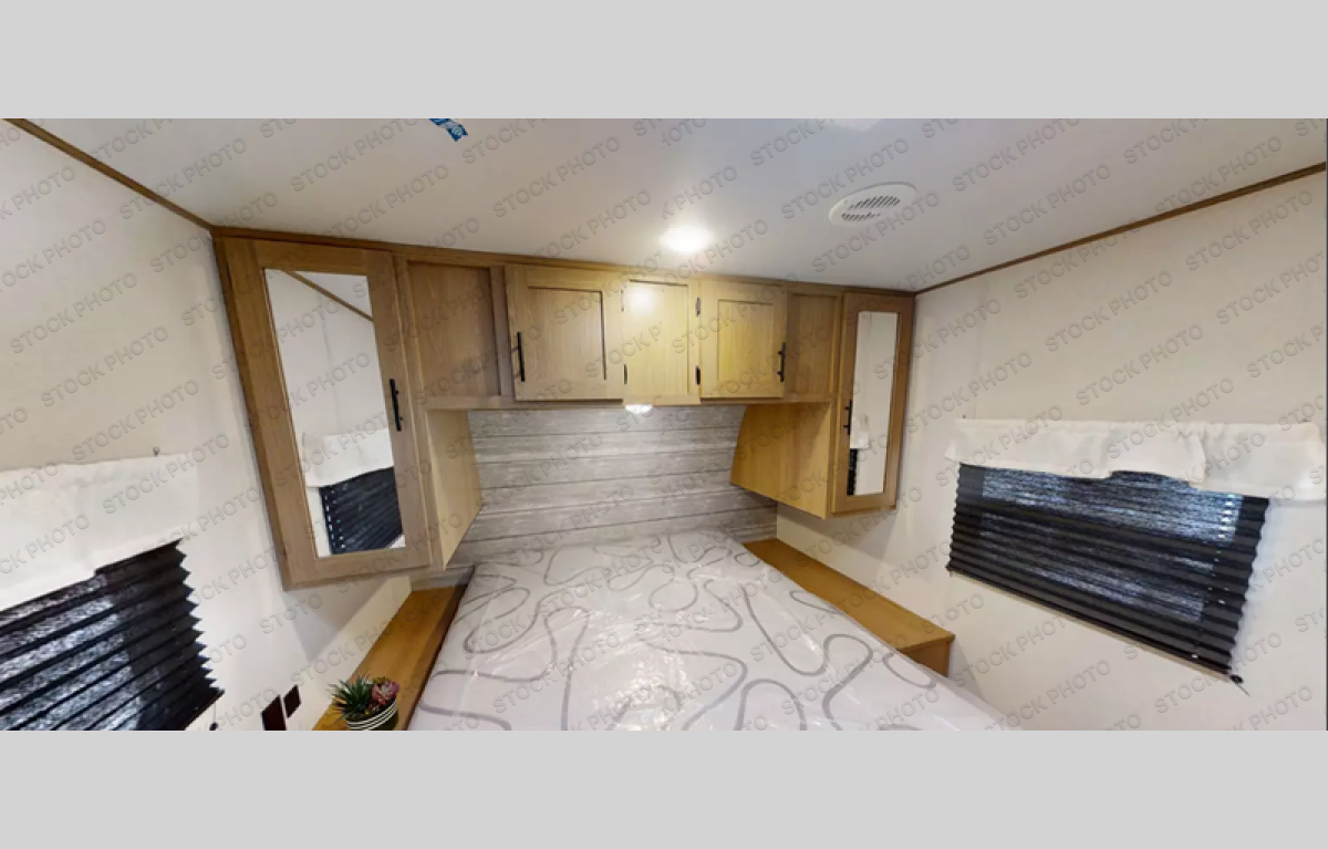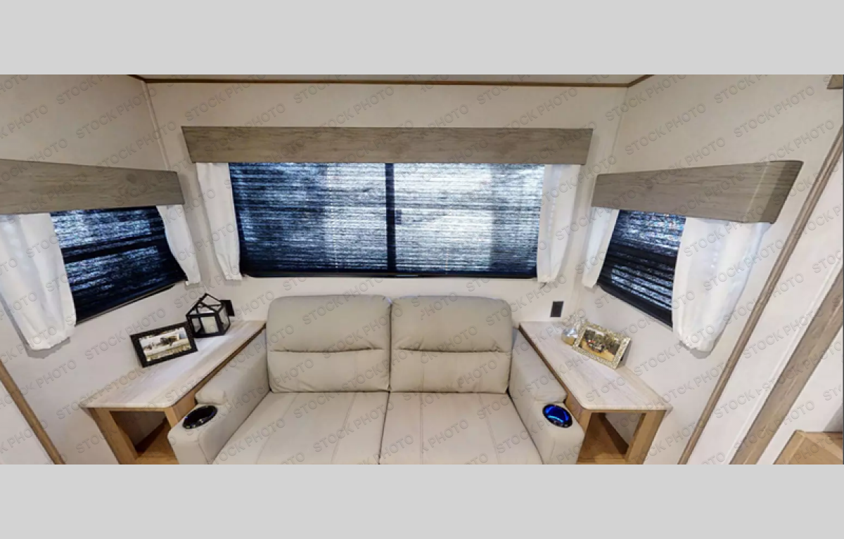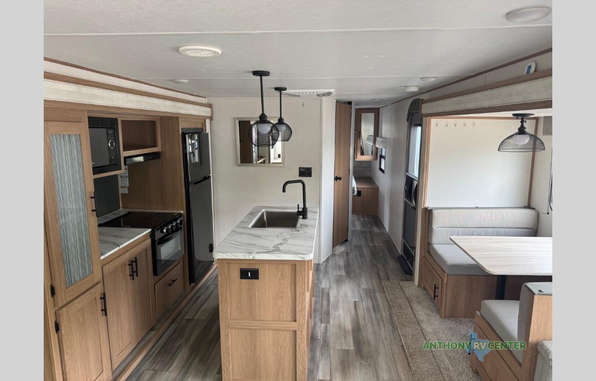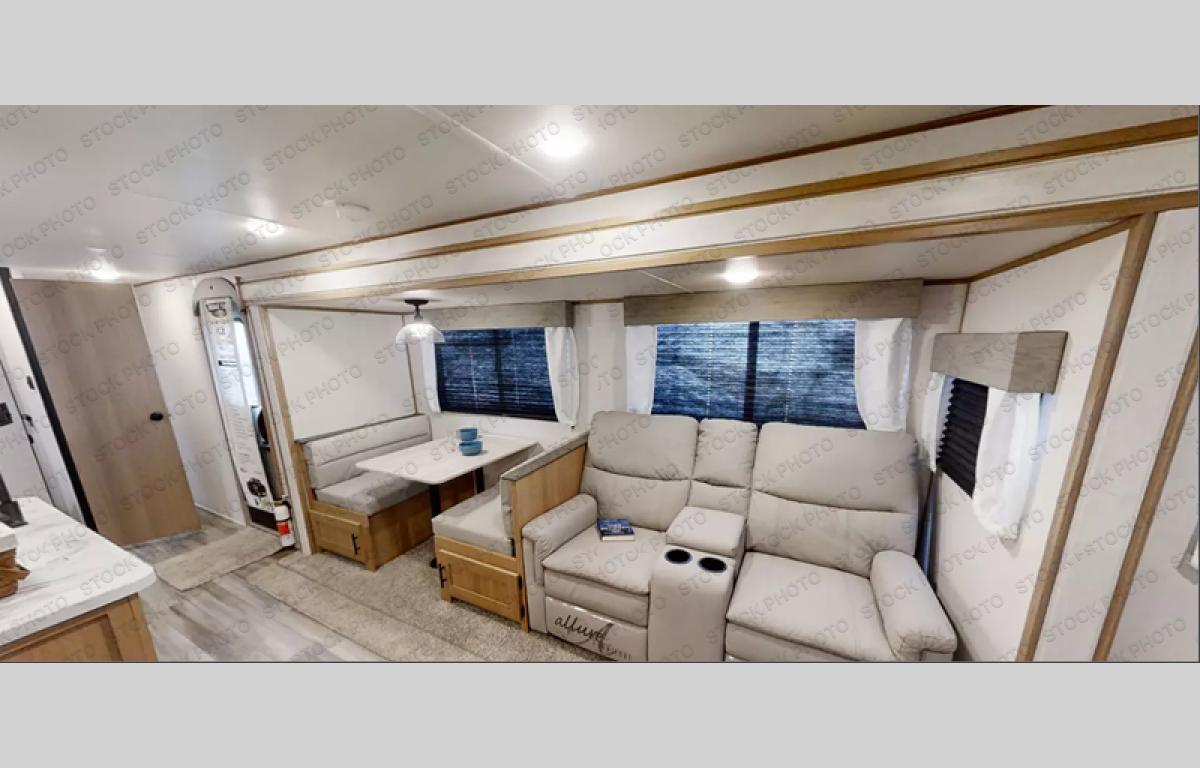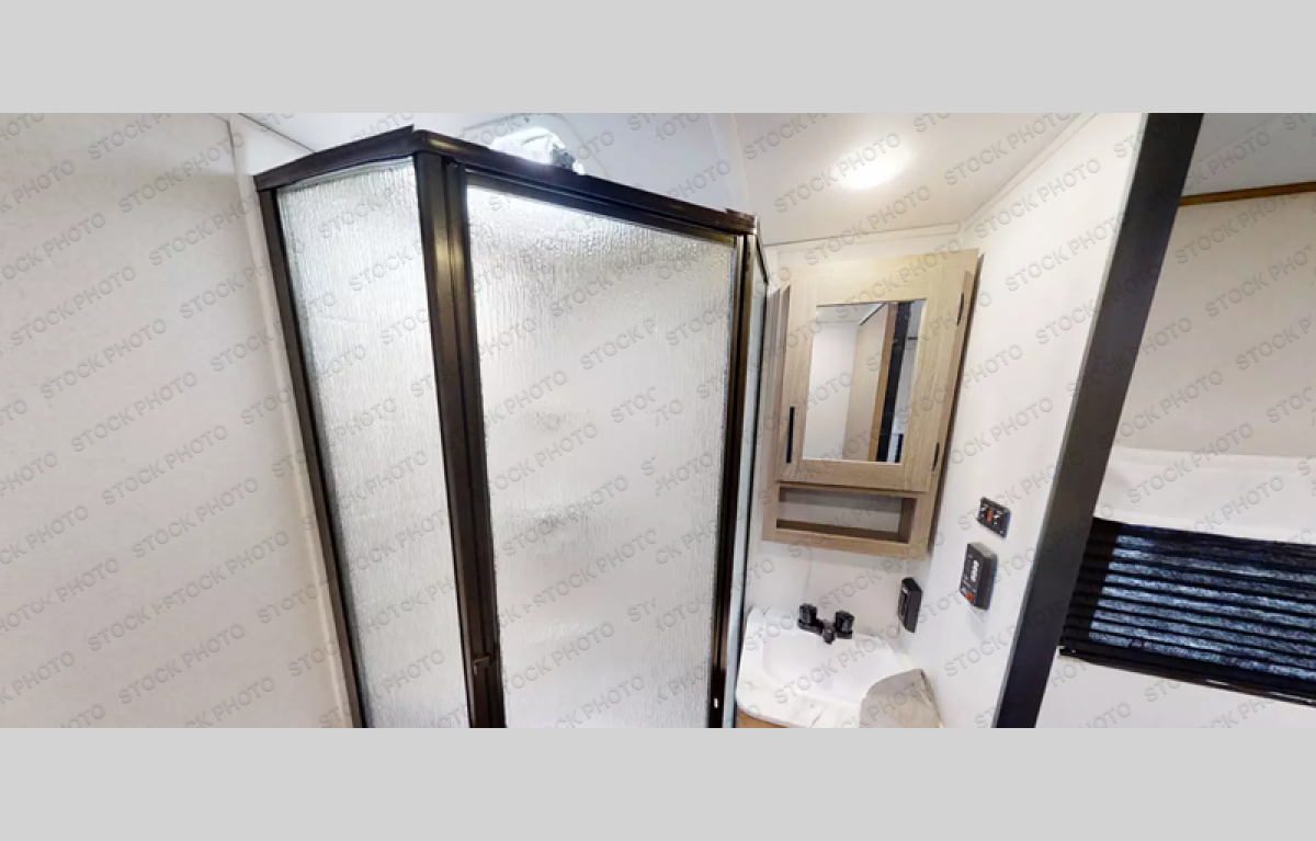 A couple or family will enjoy all the space in the main living and kitchen area, and the privacy in the front bedroom. As you spend each night sleeping on the queen-size bed in the master suite, you will appreciate the convenience of discreetly entering the full bathroom with a neo-angled shower without waking up your guests who are sleeping on the sofa or booth dinette. Because there have been two opposing slides included in the central living area, there is plenty of space to prep dinner or wash dishes on the kitchen island.